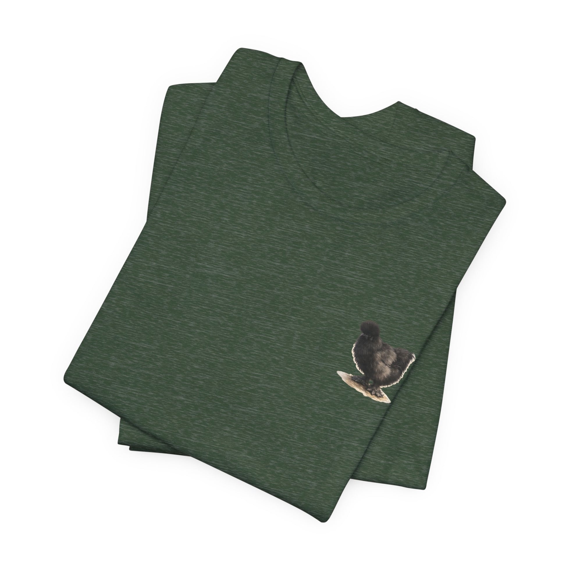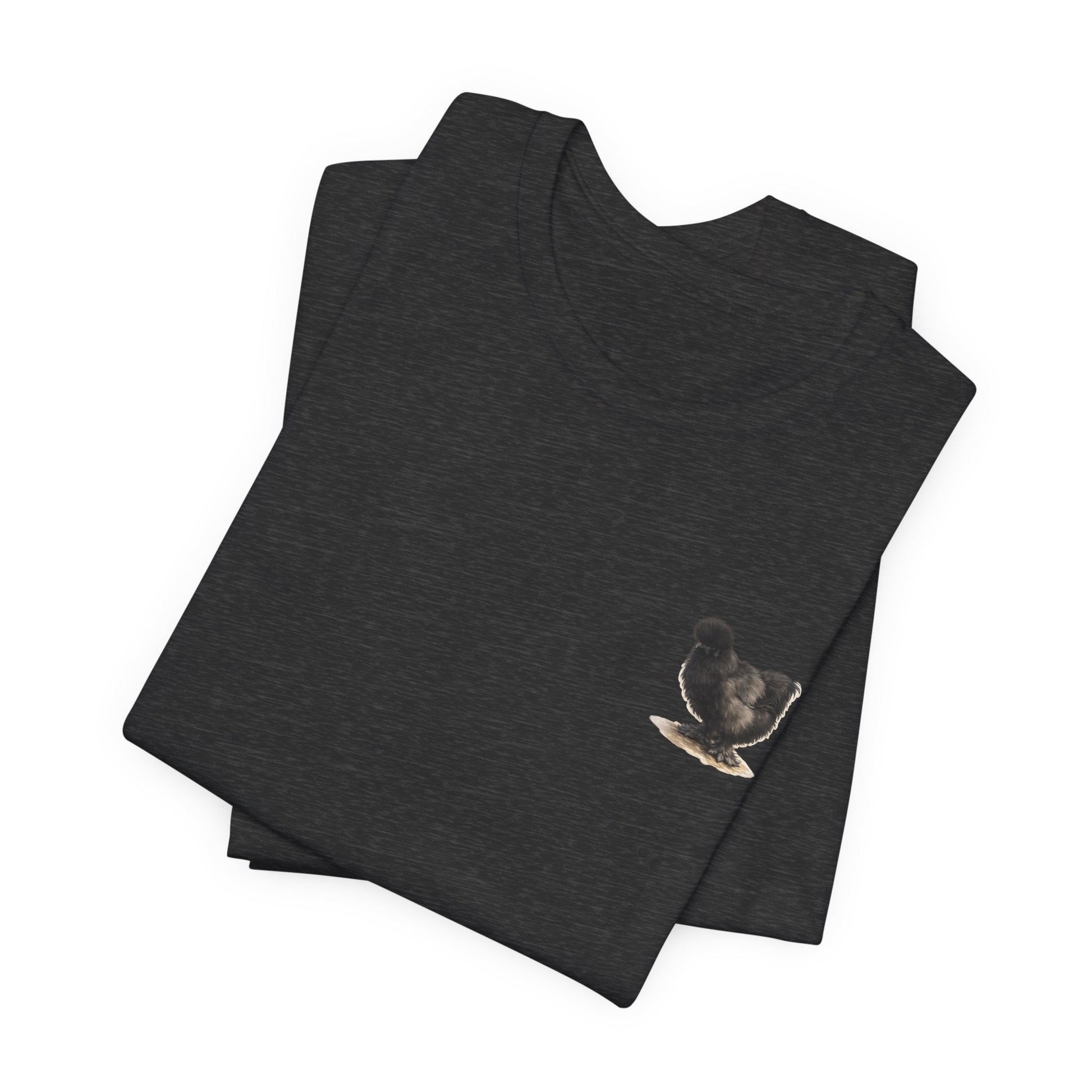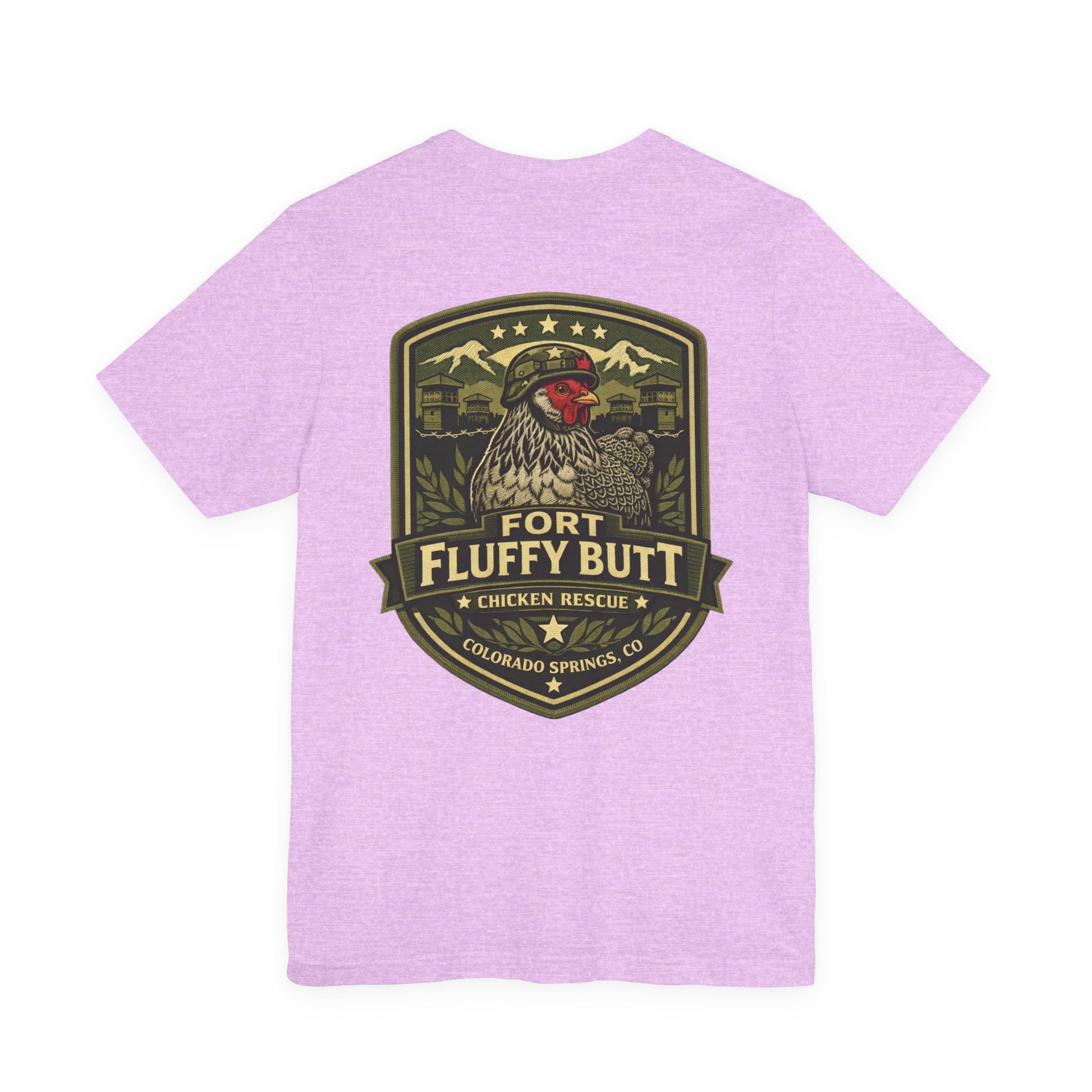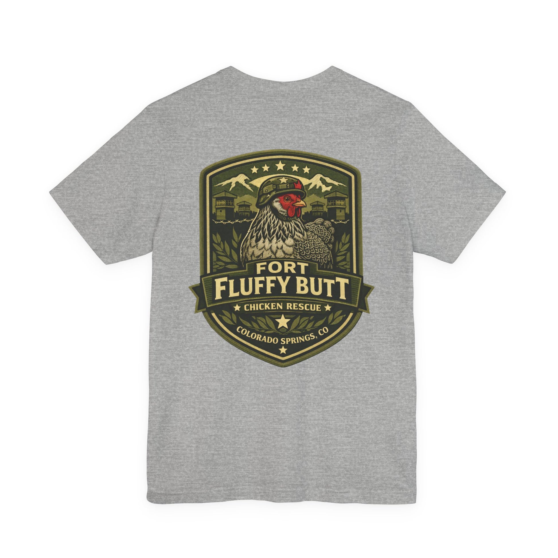 This breathable Jersey Tee carries a quietly bold story: a small chest icon up front featuring basil the silkie and a full-back emblem that reads “Fort Fluffy Butt — Chicken Rescue.” It feels lived-in from the first wear — soft, lightweight cotton with a clean crew neckline that layers easily under jackets or stands alone. The design blends rustic patch aesthetics with playful rescue-house personality, making it feel like a favorite shirt you reach for on weekend drives to the coop, volunteer days, or slow mornings with coffee and hens. It sits just right in everyday wardrobes — understated on the outside, adventurous on the back.