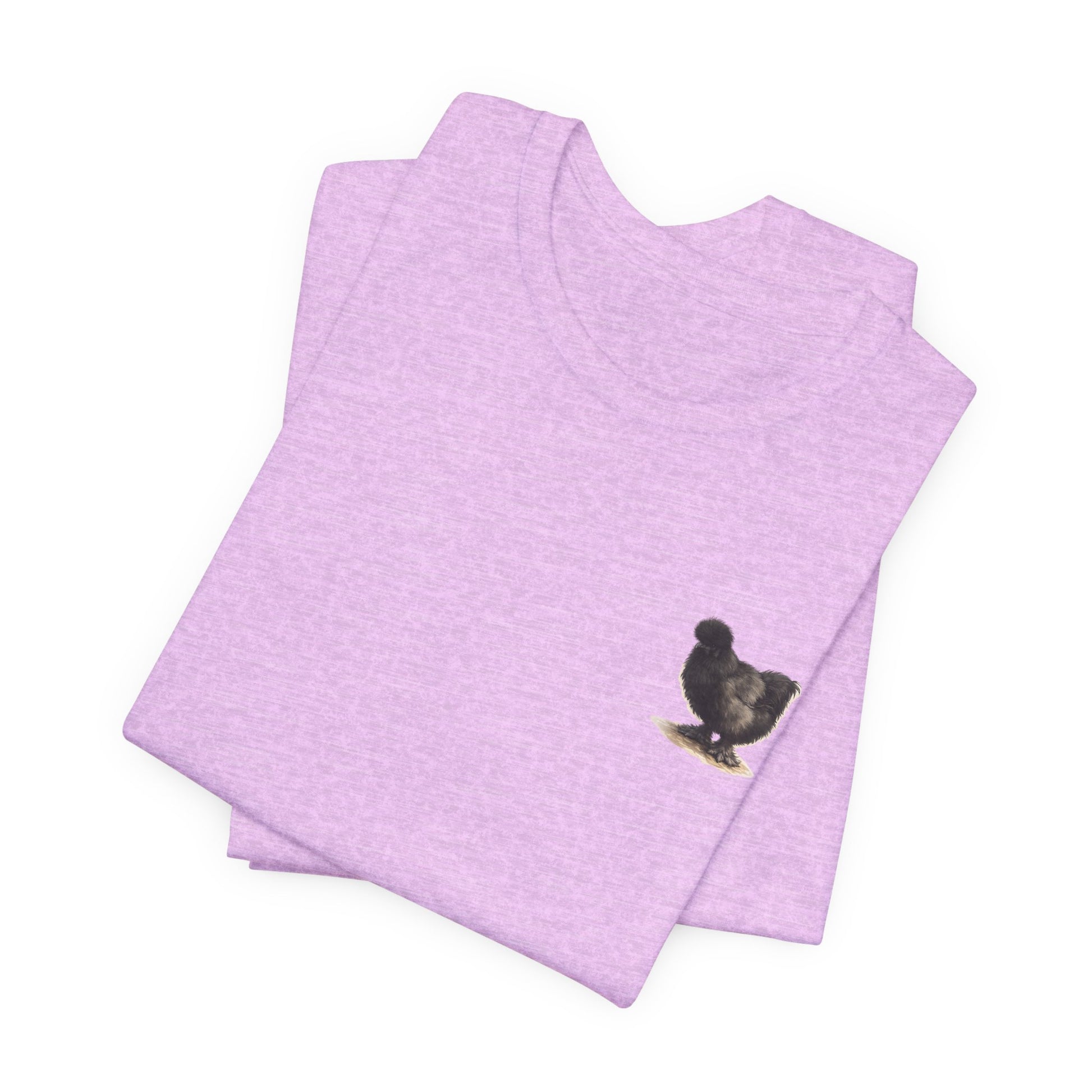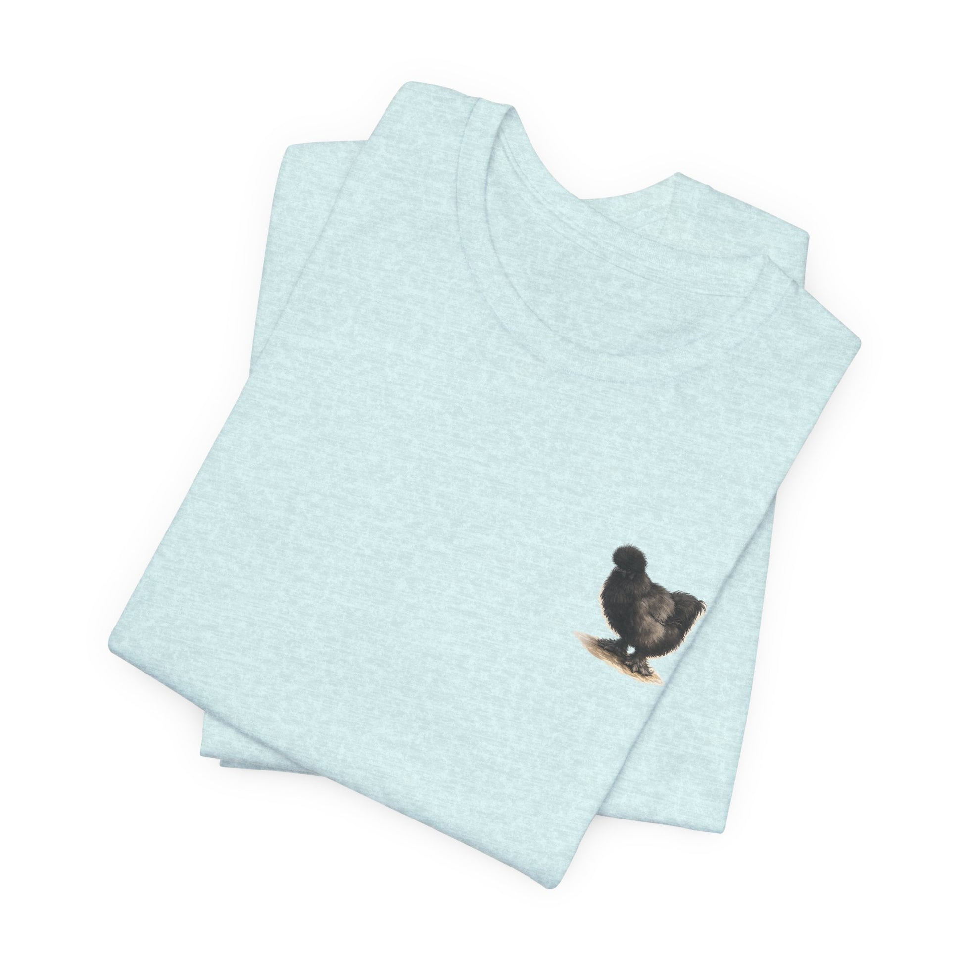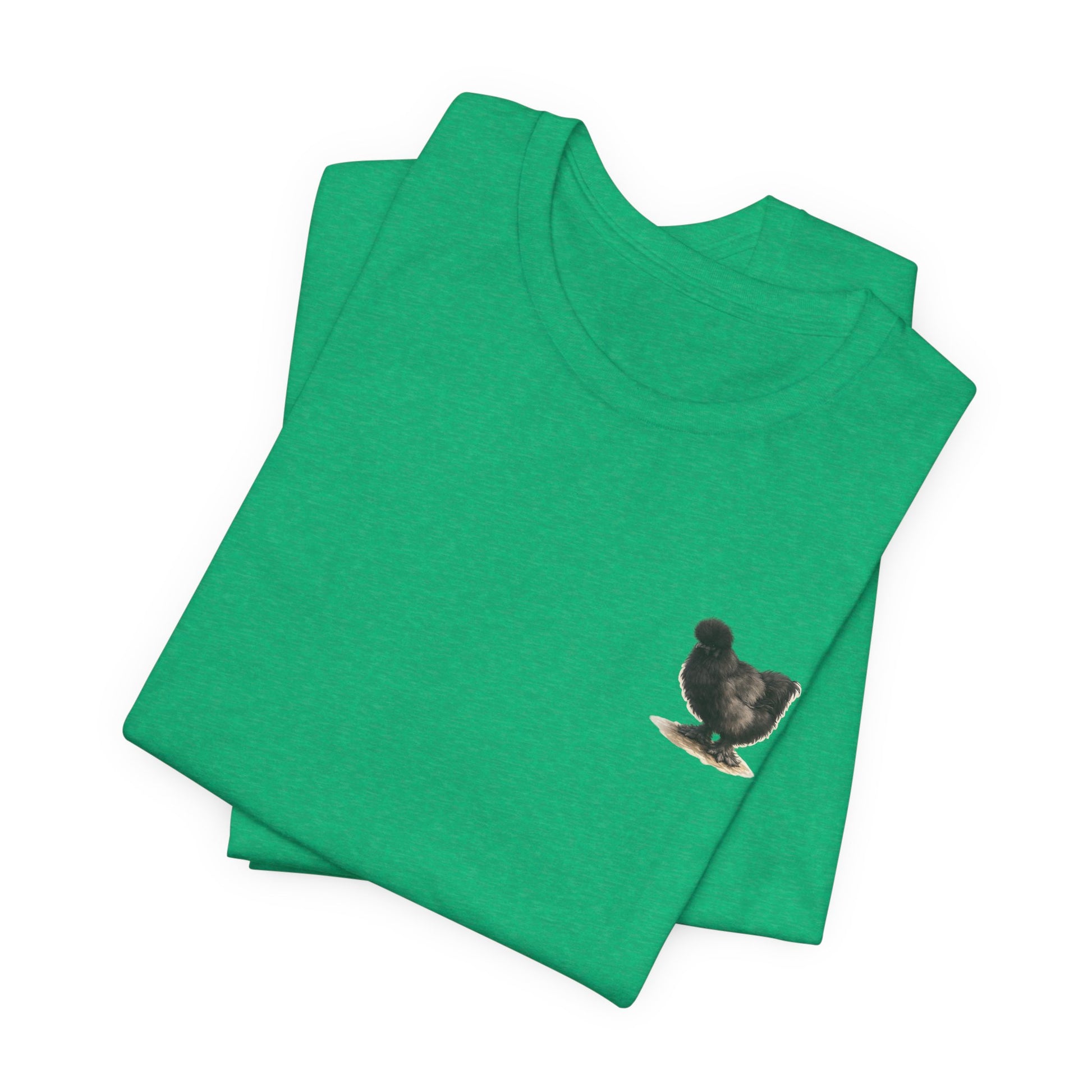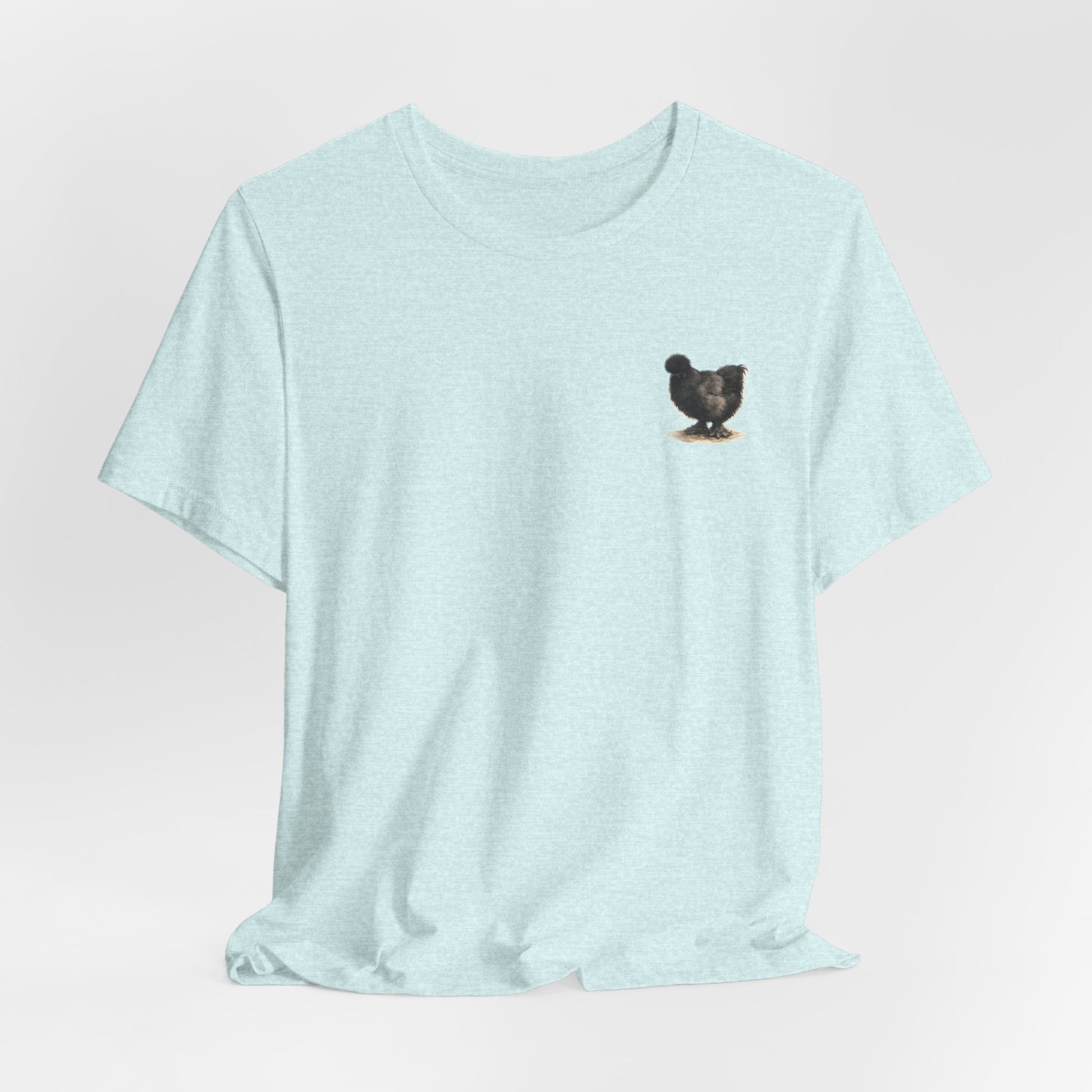This breathable Jersey Tee carries a quietly bold story: a small chest icon up front featuring basil the silkie and a full-back emblem that reads “Fort Fluffy Butt — Chicken Rescue.” It feels lived-in from the first wear — soft, lightweight cotton with a clean crew neckline that layers easily under jackets or stands alone. The design blends rustic patch aesthetics with playful rescue-house personality, making it feel like a favorite shirt you reach for on weekend drives to the coop, volunteer days, or slow mornings with coffee and hens. It sits just right in everyday wardrobes — understated on the outside, adventurous on the back.