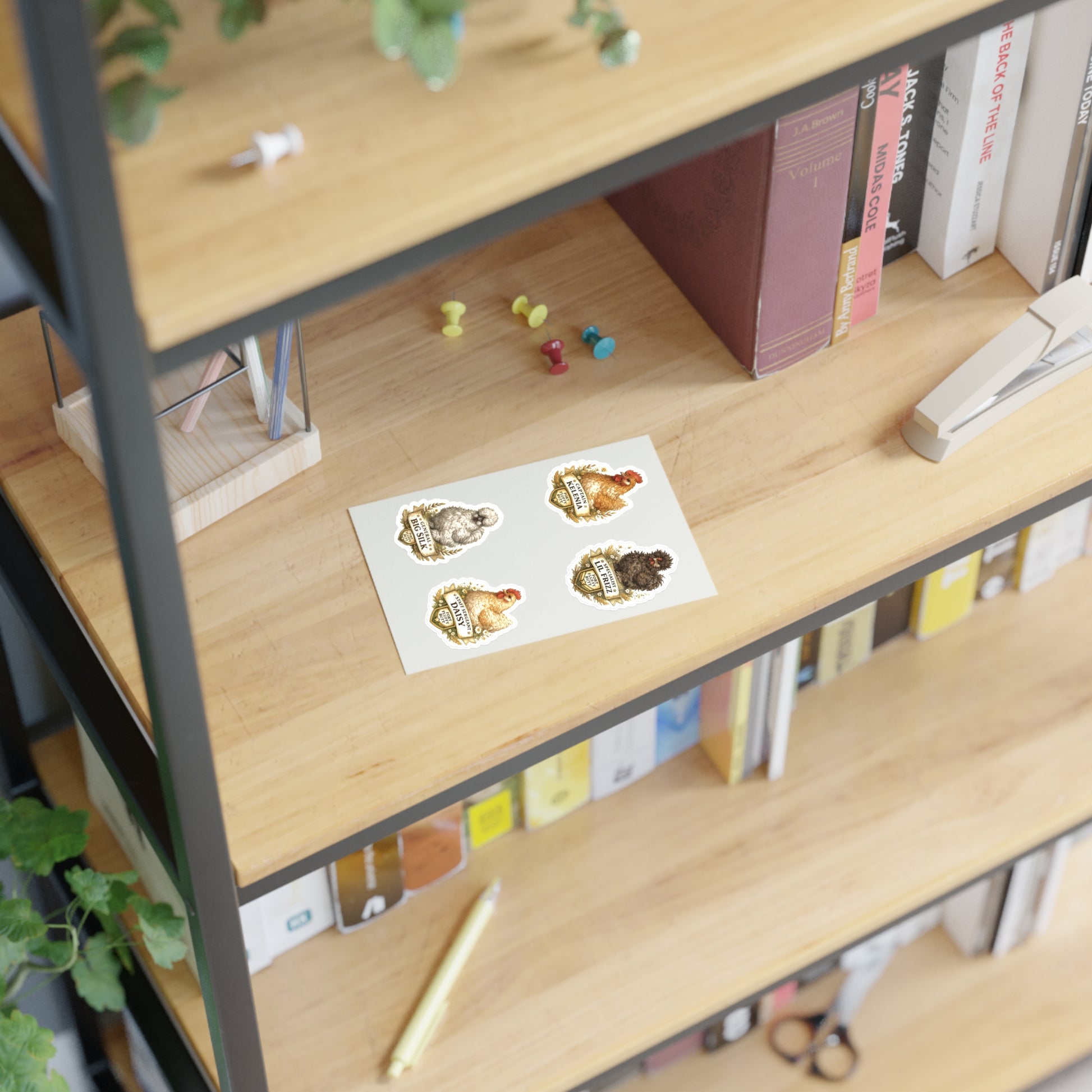 Bring a touch of charm from the ladies of Fort Fluffy Butt to your planner, laptop, or favorite notebook with these illustrated chicken sticker sheets. Each sheet shows four whimsically detailed hen portraits framed with vintage-style name banners — featuring Daisy, Big Silk, Lil Frizz, and Kelenia. The matte finish and protective UV laminate keep colors soft and muted while standing up to everyday wear. Stick one on a mason jar, a tool crate, or a recipe binder to make ordinary things feel personal and hand-tended.